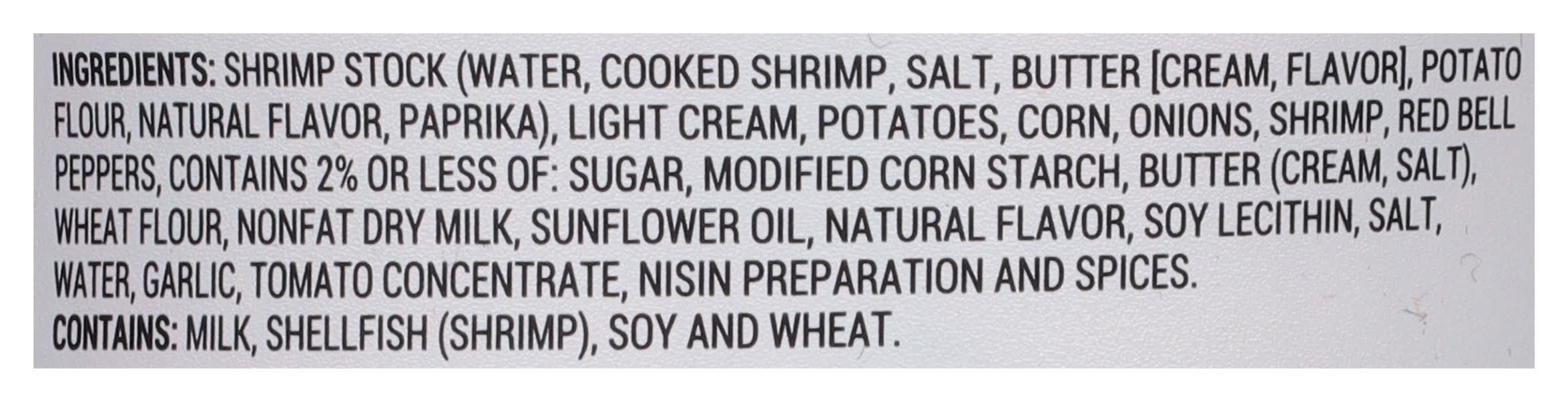 Ingredients: Shrimp Stock (Water, Cooked Shrimp, Salt, Butter [Cream, Flavor), Potato Flour, Natural Flavor, Paprika), Light Cream, Potatoes, Corn, Onions, Shrimp, Red Bell Peppers, Contains 2% or Less of: Sugar, Modified Corn Starch, Butter (Cream, Salt), Wheat Flour, Nonfat Dry Milk, Sunflower Oil, Natural Flavor, Soy Lecithin, Salt, Water, Garlic, Tomato Concentrate, Nisin Preparation and Spices Contains: Milk, Crustacean Shellfish, Shrimp, Soybeans, Wheat, Corn