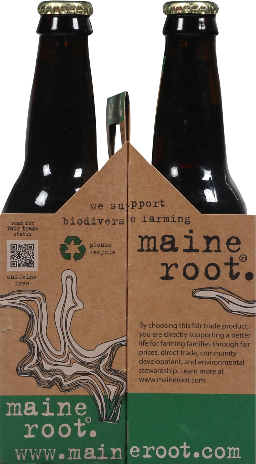 Caffeine free. No high fructose corn syrup. www.maineroot.com. Scan for fair trade status. We support biodiverse farming. By choosing this fair trade product, you are directly supporting a better life for farming families through fair prices, direct trade, community development, and environmental stewardship. Learn more at www.maineroot.com. At maine root, we choose to source the most environmentally/socially responsible and best tasting ingredients we can. In 2007 we took it a step further by sourcing our entire product line with fair trade cane sugar. Fair trade certification empowers farmers to lift themselves out of poverty by investing in their farms and communities all while protecting the environment. We support environmentally sustainable farming methods that protect farmers' health and preserve valuable ecosystems for future generations. Fair trade also supports. Fair labor conditions. Direct trade. Community development. Environmental sustainability. Learn more at www.maineroot.com. Please recycle. Pack size: 4