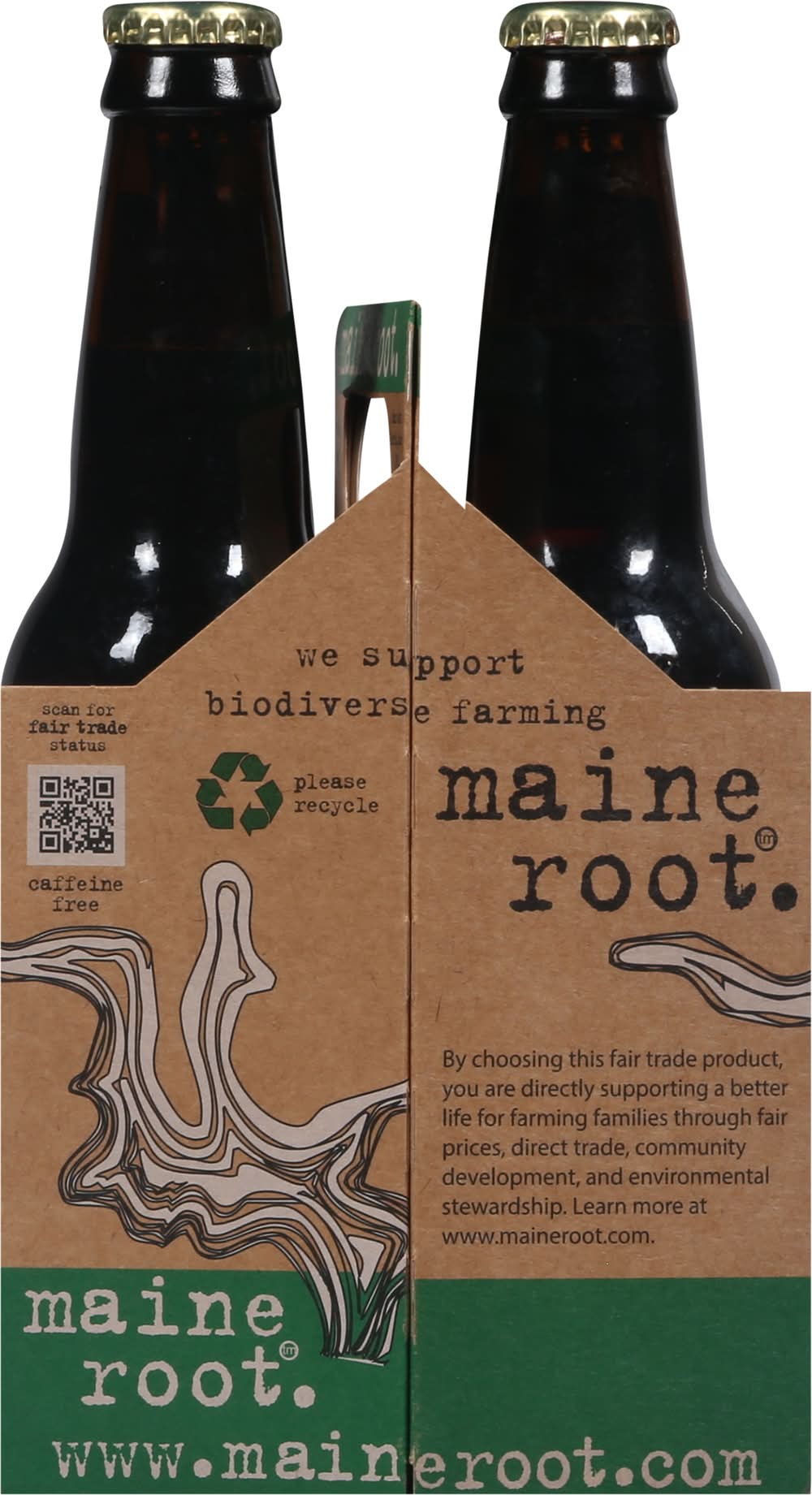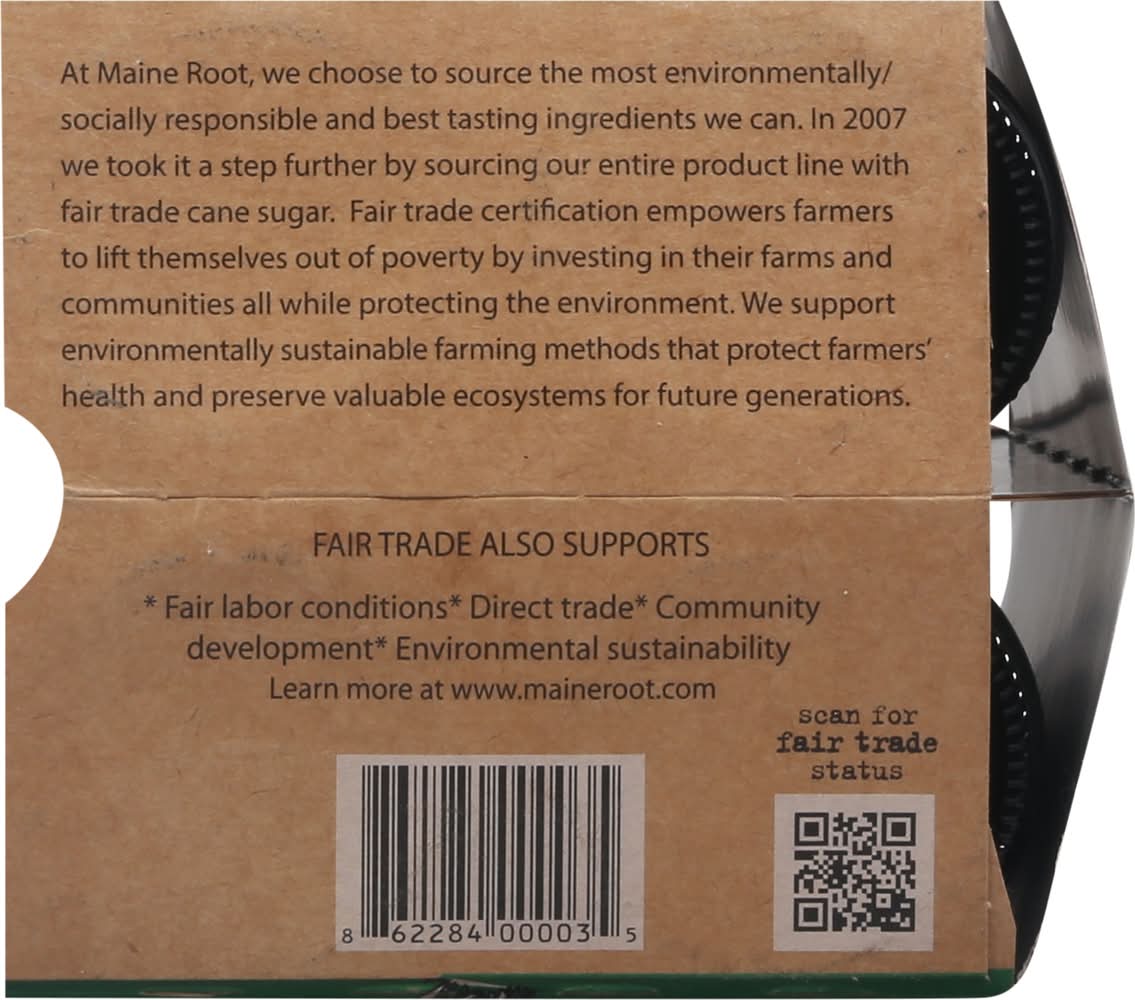 Caffeine free. No high fructose corn syrup. www.maineroot.com. Scan for fair trade status. We support biodiverse farming. By choosing this fair trade product, you are directly supporting a better life for farming families through fair prices, direct trade, community development, and environmental stewardship. Learn more at www.maineroot.com. At maine root, we choose to source the most environmentally/socially responsible and best tasting ingredients we can. In 2007 we took it a step further by sourcing our entire product line with fair trade cane sugar. Fair trade certification empowers farmers to lift themselves out of poverty by investing in their farms and communities all while protecting the environment. We support environmentally sustainable farming methods that protect farmers' health and preserve valuable ecosystems for future generations. Fair trade also supports. Fair labor conditions. Direct trade. Community development. Environmental sustainability. Learn more at www.maineroot.com. Please recycle. Pack size: 4