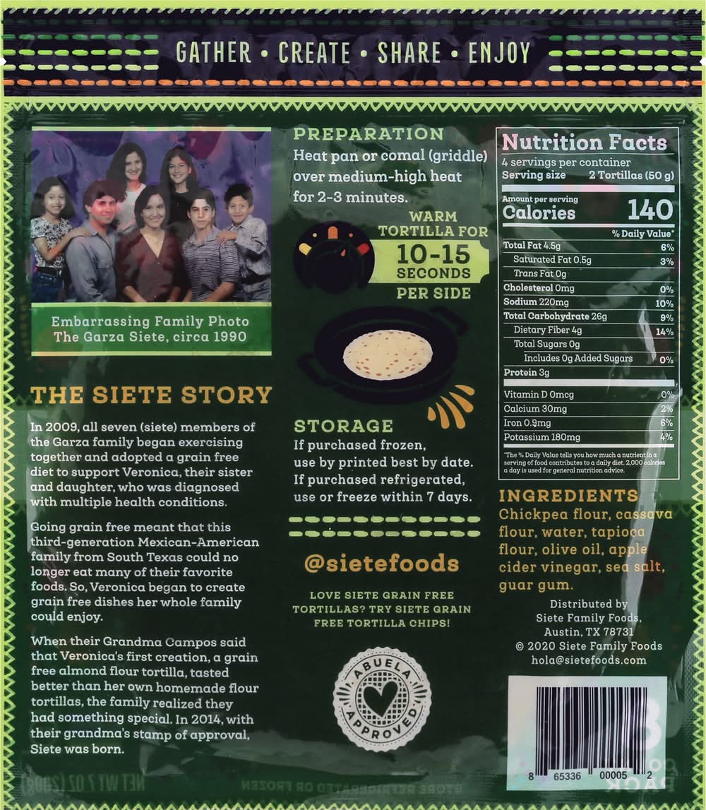 Paleo. Gluten free. Dairy free. Soy free. Vegan. Certified gluten-free. Grain free. Non GMO Project verified. nongmoproject.org. Non GMO. Gather. Create. Share. Enjoy. Embarrassing family photo The Garza Siete, circa 1990. The Siete Story: In 2009, all seven (siete) members of the Garza family began exercising together and adopted a grain free diet to support Veronica, their sister and daughter, who was diagnosed with multiple health conditions. Going grain free meant that this third-generation Mexican-American family from South Texas could no longer eat many of their favorite foods. So, Veronica began to create grain free dishes her whole family could enjoy. When their Grandma Campos said that Veronica's first creation, a grain free almond flour tortilla, tasted better than her own homemade flour tortillas, the family realized they had something special. In 2014, with their grandma's stamp of approval. Siete was born. Abuela approved. sietefoods.com. (at)sietefoods. Love Siete Grain Free Tortillas? Try Siete Grain Free Tortilla Chips!