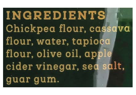 Ingredients: Chickpea Flour, Cassava Flour, Water, Tapioca Flour, Olive Oil, Apple Cider Vinegar, Sea Salt, Guar Gum