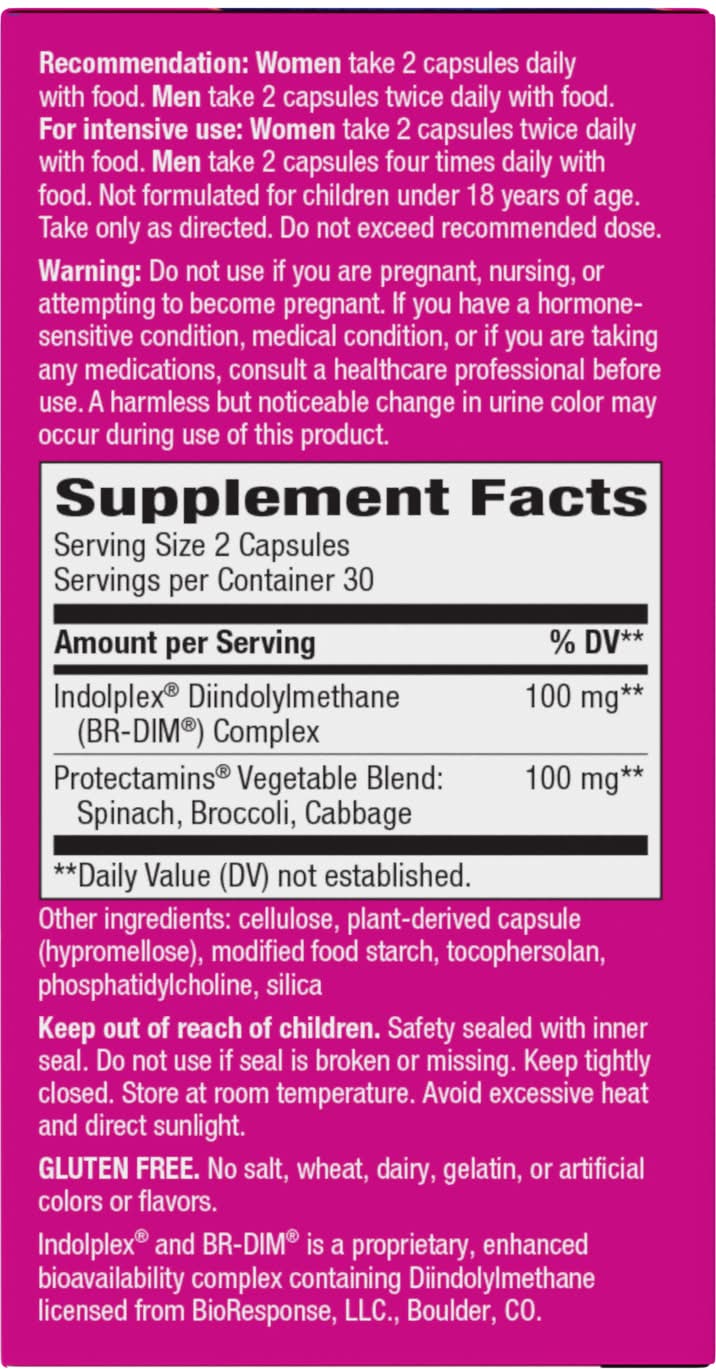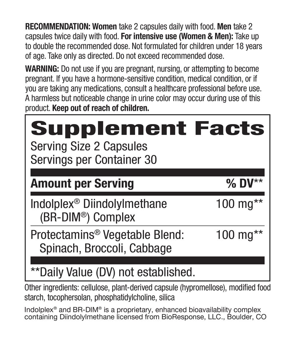 Ingredients: Indolplex® Diindolylmethane (BR-DIM®) Complex; Protectamins® Vegetable Blend: Spinach, Broccoli, Cabbage; Cellulose; Plant-Derived Capsule (Hypromellose); Modified Food Starch; Tocophersolan; Phosphatidylcholine; Silica
