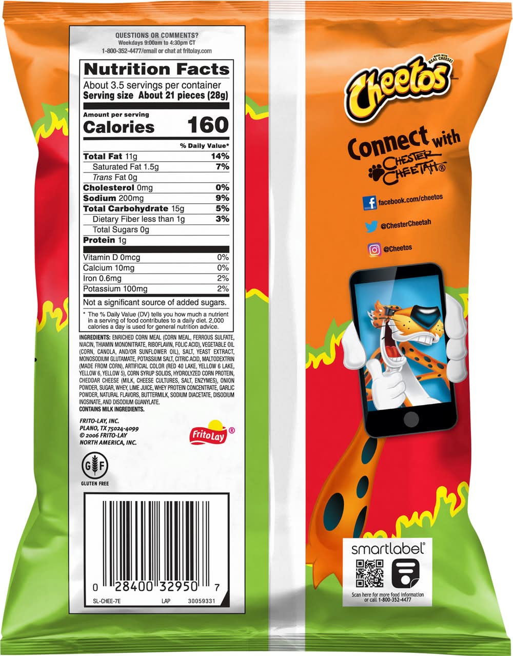Ingredients: Enriched Corn Meal (Corn Meal, Ferrous Sulfate, Niacin, Thiamin Mononitrate, Riboflavin, Folic Acid), Vegetable Oil (Corn, Canola, and/or Sunflower Oil), and Less than 2% of Salt, Yeast Extract, Monosodium Glutamate, Potassium Salt, Citric Acid, Maltodextrin (Made from Corn), Artificial Color (Red 40 Lake, Yellow 6 Lake, Yellow 6, Yellow 5), Corn Syrup Solids, Hydrolyzed Corn Protein, Cheddar Cheese (Milk, Cheese Cultures, Salt, Enzymes), Onion Powder, Sugar, Whey, Lime Juice, Whey Protein Concentrate, Garlic Powder, Natural Flavors, Buttermilk, Sodium Diacetate, Disodium Inosinate, and Disodium Guanylate Contains: Milk, Corn