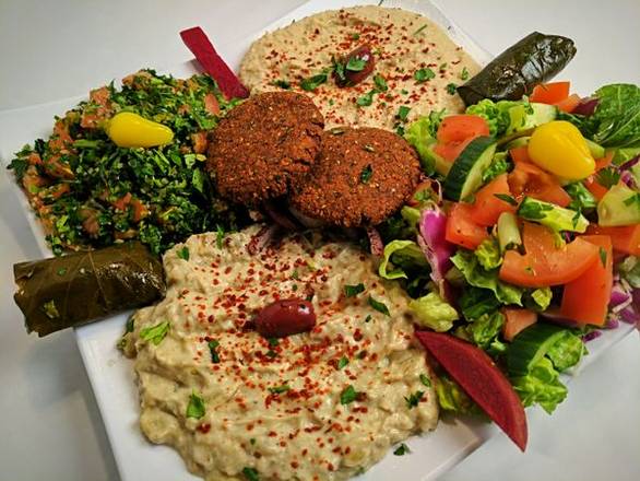 2 piece falafel, 2 piece sarma, salad, tabouli, hummus, eggplant dip (baba ganoush), and warm pita bread.