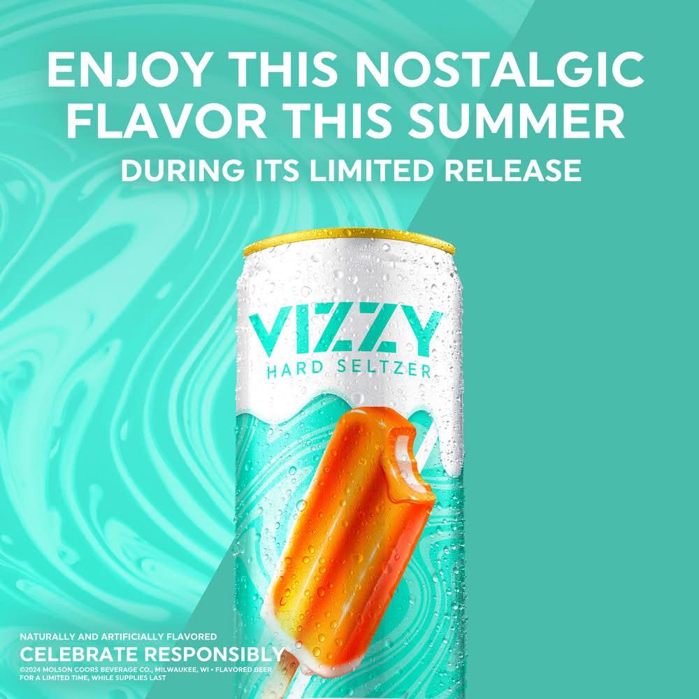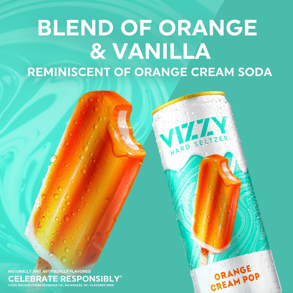 Back for a limited time! Enjoy the summertime favorite Vizzy Orange Cream Pop Hard Seltzer with 4.5% ABV. An ice-pop inspired, nostalgic blend of orange and vanilla with a touch of sweetness reminiscent of orange cream soda, this vibrantly flavored spiked seltzer offers a burst of cool flavor on a hot summer day. Pairs perfectly with all your favorite outdoor activities like pickleball, golf, beach days or anytime you feel like savoring a crisp, refreshing spin on a classic favorite. Pick up a 12 pack of 12.0 fl oz cans today, and enjoy this delicious Vizzy seltzer while you can, because it will only be around for summer. • Brand: Vizzy • Pack size: 12 • Features : gluten-free • Alcohol by volume: 4.5% • Tasting notes: vanilla, creamy, flavored