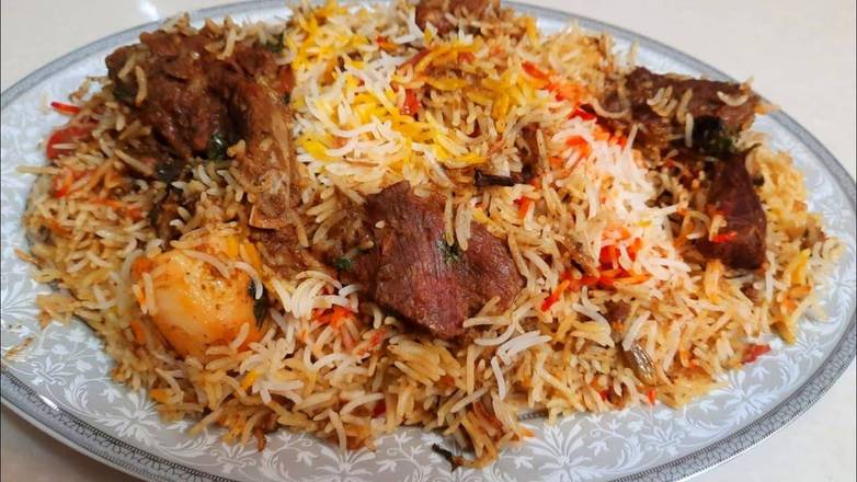 GLUTEN FREE - Rich, aromatic spices import from Hyderabad, India, featuring long-grain basmati rice layered with tender, marinated with choice of your proteins, spices, and caramelized onions, traditionally cooked in a sealed pot for deep flavor