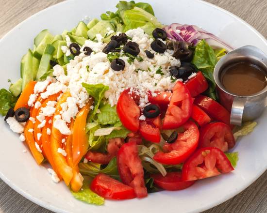 Romaine lettuce, spring green mix, feta cheese, tomato, Persian cucumber, onion, bell peppers and olive with balsamic dressing.