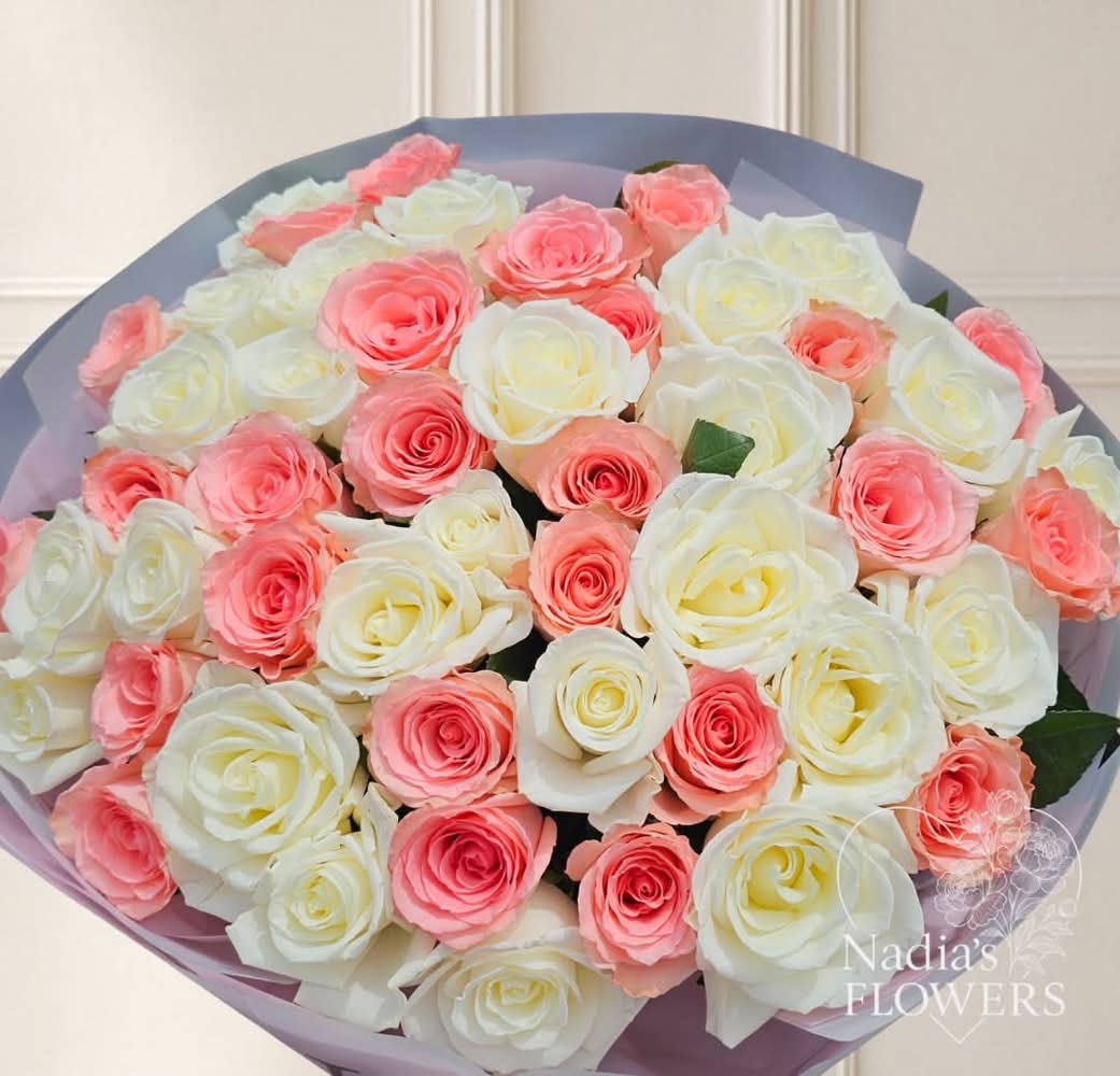 An irresistible blend of creamy white and amazing pink roses, reminiscent of a delicate dessert on a summer afternoon. This bouquet brings a sense of purity, sweetness, and joy—ideal for expressing love, gratitude, or warm wishes.