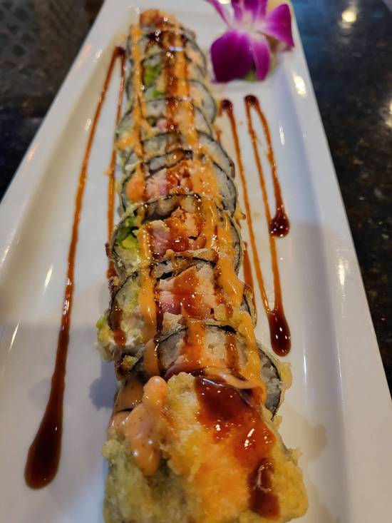 Tuna, salmon, spicy crab, avocado, and cream cheese topped with spicy mayo, eel sauce, and kimchi sauce.