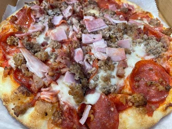 Pepperoni, ham, sausage, ground beef, bacon, and our homemade pizza sauce.