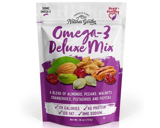 KEEP YOUR HEART TICKING. Packed full of omega-3, and with no cholesterol, sodium, or trans fats. Grab a bag of Nature’s Garden omega-3 deluxe nut mix and add some vitality to your snacking! This gourmet mix is diet friendly.