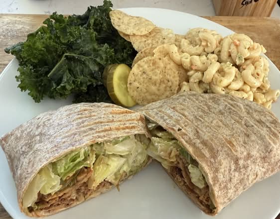Crispy buffalo seitan, ranch dressing, cashew cheese sauce, lettuce, and crushed corn tortilla chips in a toasted whole wheat wrap.