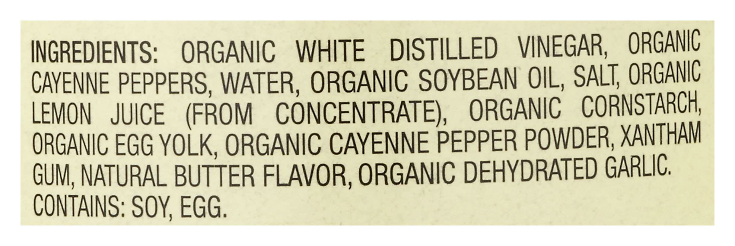 Ingredients: Organic White Distilled Vinegar, Organic Cayenne Peppers, Water, Organic Soybean Oil, Salt, Organic Lemon Juice (from Concentrate), Organic Cornstarch, Organic Egg Yolk, Organic Cayenne Pepper Powder, Xantham Gum, Natural Butter Flavor, Organic Dehydrated Garlic Contains: Soybeans, Eggs