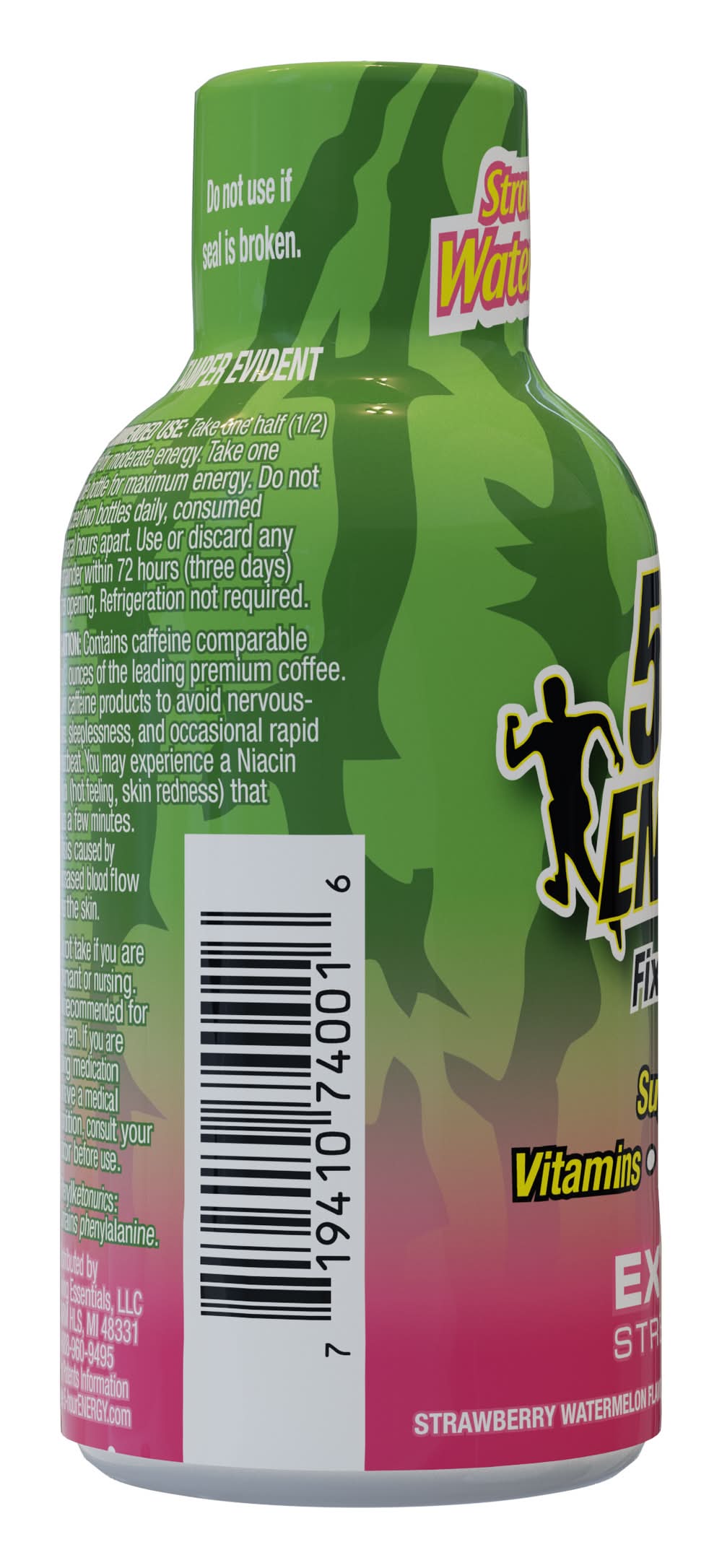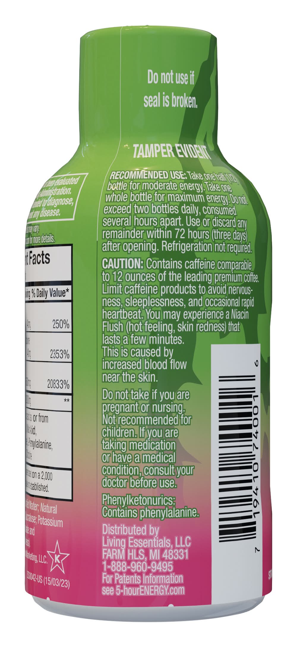 5-Hour Energy Extra Strength Supplement in strawberry watermelon flavor is a dietary supplement that is sugar-free. It contains a blend of vitamins and nutrients, along with caffeine, designed to support energy levels. Individual results with the supplement may vary. It is important to note that the statements regarding the dietary supplement have not been evaluated by the Food and Drug Administration and it is not designed to diagnose, treat, cure, or prevent any disease. • Flavor: Strawberry-watermelon • Living Essentials, LLC, Farm Hls,MI,48331 • Packaging: Reusable