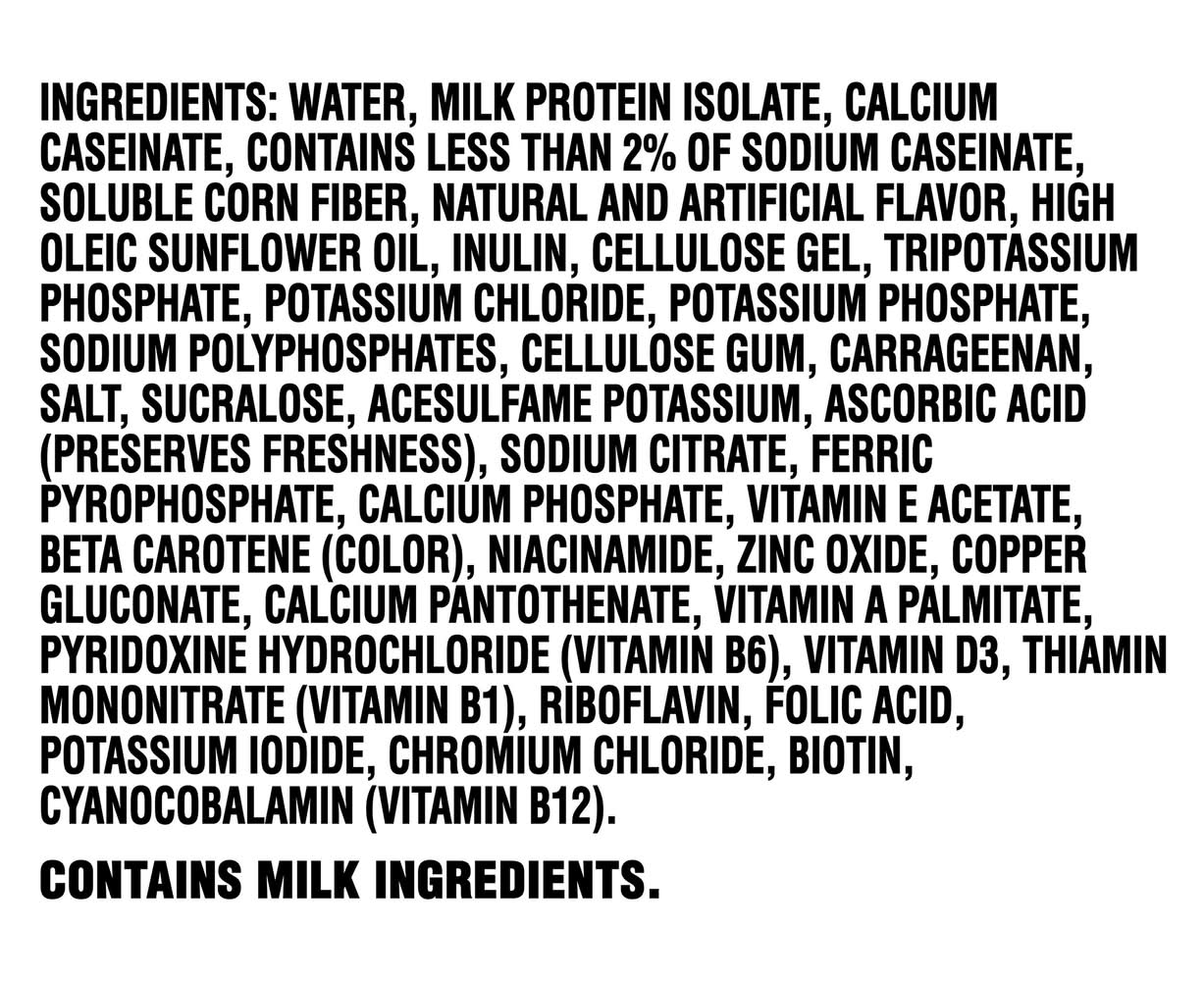 Ingredients: Water, Milk Protein Isolate, Calcium Caseinate, Contains Less than 2% of Sodium Caseinate, Soluble Corn Fiber, Natural and Artificial Flavor, High Oleic Sunflower Oil, Inulin, Cellulose Gel, Tripotassium Phosphate, Potassium Chloride, Potassium Phosphate, Sodium Polyphosphates, Cellulose Gum, Carrageenan, Salt, Sucralose, Acesulfame Potassium, Ascorbic Acid (Preserves Freshness), Sodium Citrate, Ferric Pyrophosphate, Calcium Phosphate, Vitamin E Acetate, Beta Carotene (Color), Niacinamide, Zinc Oxide, Copper Gluconate, Calcium Pantothenate, Vitamin A Palmitate, Pyridoxine Hydrochloride (Vitamin B6), Vitamin D3, Thiamin Mononitrate (Vitamin B1), Riboflavin, Folic Acid, Potassium Iodide, Chromium Chloride, Biotin, Cyanocobalamin (Vitamin B12) Contains: Milk