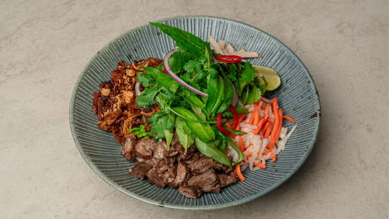 beef belly, pork roll, beef tongue, rau ram, vermicelli *This dish contains or may come in contact with: fish, shellfish, soy, gluten, dairy