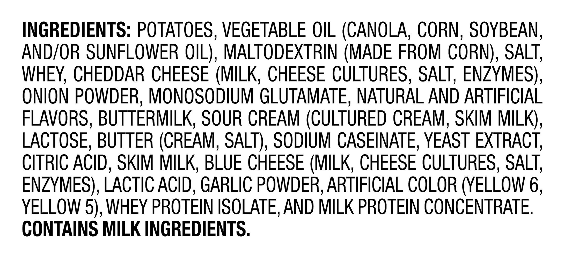 Ingredients: Potatoes, Vegetable Oil (Canola, Corn, Soybean, and/or Sunflower Oil), Maltodextrin (Made from Corn), Salt, Whey, Cheddar Cheese (Milk, Cheese Cultures, Salt, Enzymes), Onion Powder, Monosodium Glutamate, Natural and Artificial Flavors, Buttermilk, Sour Cream (Cultured Cream, Skim Milk), Lactose, Butter (Cream, Salt), Sodium Caseinate, Yeast Extract, Citric Acid, Skim Milk, Blue Cheese (Milk, Cheese Cultures, Salt, Enzymes), Lactic Acid, Garlic Powder, Artificial Color (Yellow 6, Yellow 5), Whey Protein Isolate, and Milk Protein Concentrate Contains: Milk, Lactose, Soybeans
