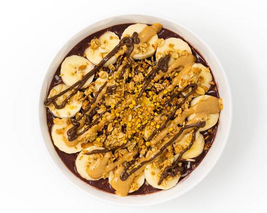 Organic sambazon acai, banana, and organic hemp seed granola. Drizzled with Nutella and peanut butter.