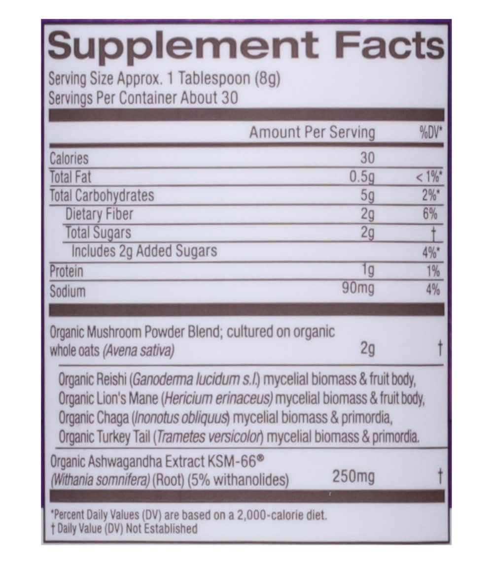 Ingredients: Organic Mushroom Powder Blend: Cultured on Organic Whole Oats (Avena Sativa): Organic Reishi (Ganoderma Lucidum, S.L, ) Mycelial Biomass & Fruit Body, Organic Lion's Mane (Hericium Erinaceus) Mycelial Biomass & Fruit Body, Organic Chaga (Inonotus Obliquus) Mycelial Biomass & Primordia, Organic Turkey Tail (Trametes Versicolor) Mycelial Biomass & Primordia. Other Ingredients: Organic Cocoa Powder (Alkalized), Organic Coconut Sugar, Organic Natural Flavors, Sea Salt, Organic Monk Fruit Extract, Xanthan Gum Contains: Tree Nuts, Coconuts, Oat, Milk, Peanuts, Soybeans, Eggs, Tree Nuts