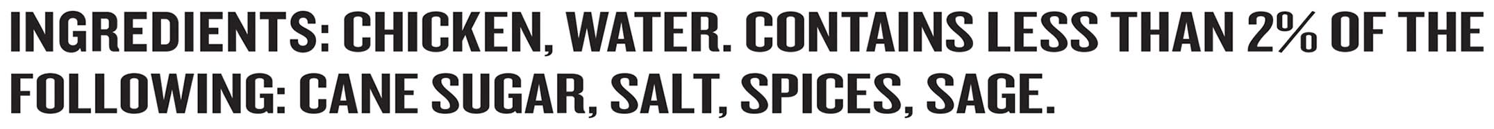 Ingredients: Chicken**, Water. Contains Less than 2% of the Following: Cane Sugar, Salt, Spices, Sage. ** Chicken Never Administered Antibiotics, Added Growth Hormones, or Fed Animal By-Products. Federal Regulations Prohibit the Use of Added Hormones in Poultry