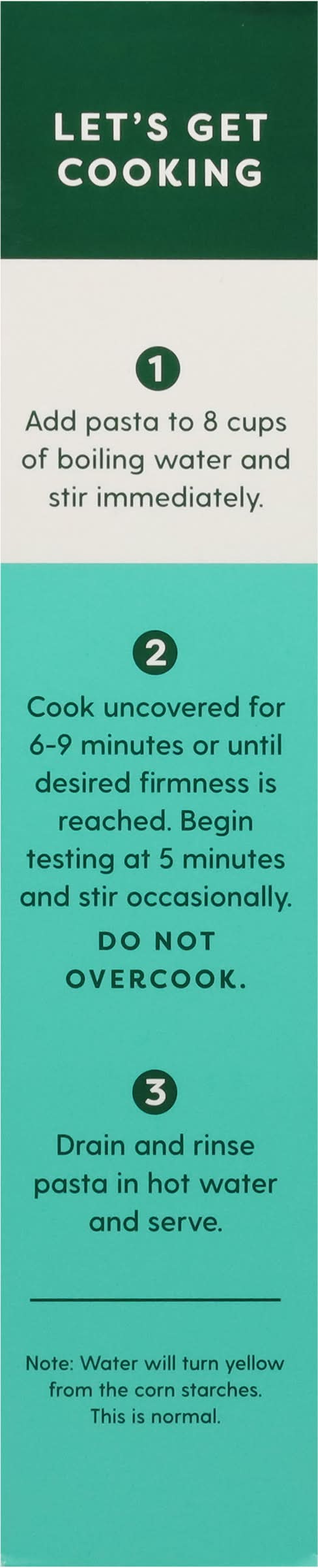 Boil: let's get cooking: (1) add pasta to 8 cups of boiling water and stir immediately. (2) cook uncovered for 6-9 minutes or until desired firmness is reached. begin tasting at 5 minutes and stir occasionally. do not overcook. (3) drain and rinse pasta in hot water and serve. note: water will turn yellow from the corn starches. this is normal.