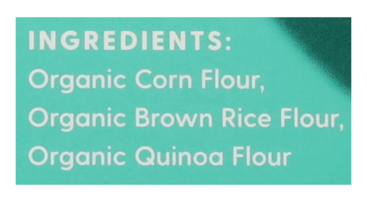 Ingredients: Organic Corn Flour, Organic Brown Rice Flour, Organic Quinoa Flour Contains: Corn