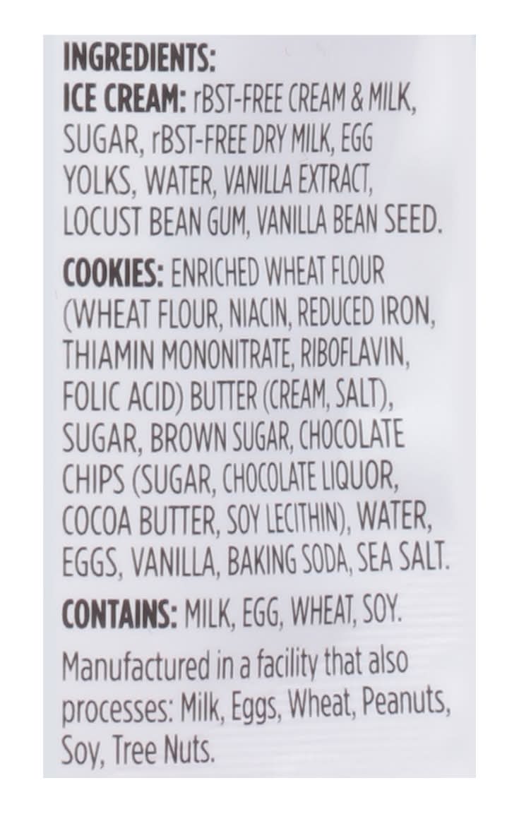 Ingredients: Ice Cream: rbST-Free Cream & Milk, Sugar, rbST-Free Dry Milk, Egg Yolks, Water, Vanilla Extract, Locust Bean Gum, Vanilla Bean Seed. Cookies: Enriched Wheat Flour (Wheat Flour, Niacin, Reduced Iron, Thiamin Mononitrate, Riboflavin, Folic Acid) Butter (Cream, Salt), Sugar, Brown Sugar, Chocolate Chips (Sugar, Chocolate Liquor, Cocoa Butter, Soy Lecithin), Water, Eggs, Vanilla, Baking Soda, Sea Salt Contains: Milk, Eggs, Wheat, Soybeans, Milk, Eggs, Wheat, Peanuts, Soybeans, Tree Nuts