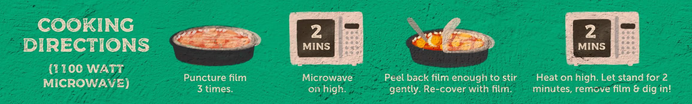 Directions for use: Cooking Directions (1100 watt microwave): Puncture film 3 times. Microwave on high. Peel back film enough to stir gently. Re-cover with film. Heat on high. Let stand for 2 minutes, remove film & dig in! For a Complete Experience, Pair with Our: Potato and pea samosas & tandoori naan. Keep frozen. Storage recommendation: Keep frozen.