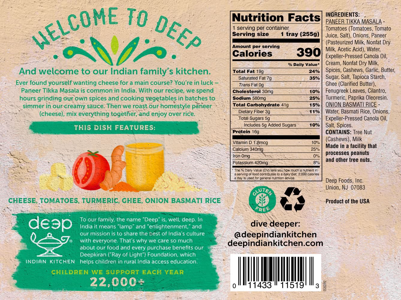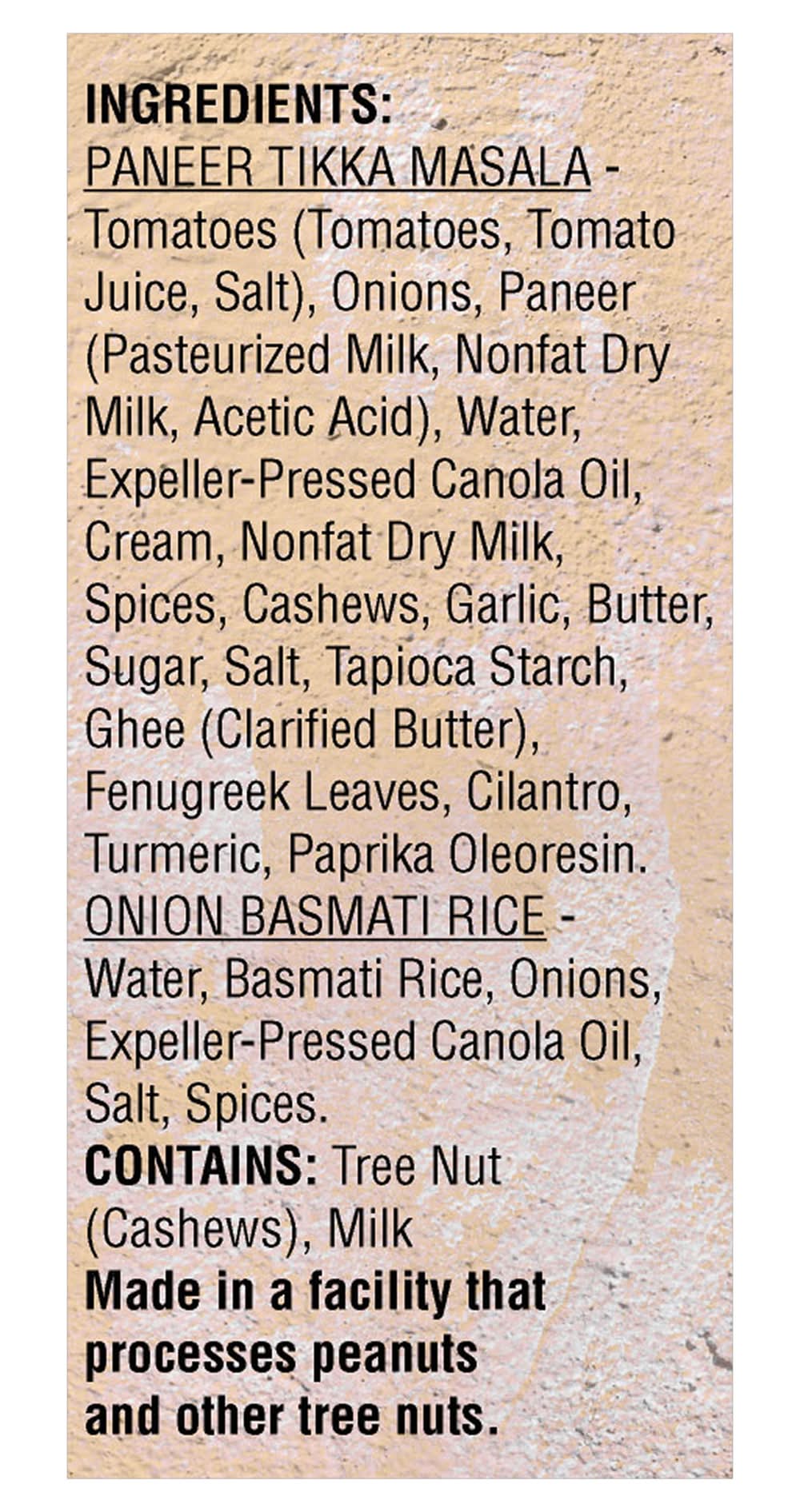 Ingredients: Paneer Tikka Masala: Tomatoes (Tomatoes, Tomato Juice, Salt), Onions, Paneer (Pasteurized Milk, Nonfat Dry Milk, Ultra Filtered Milk, Vinegar, Salt), Water, Expeller-pressed Canola Oil, Cream, Nonfat Dry Milk, Spices, Cashews, Garlic, Butter, Sugar, Salt, Tapioca Starch, Ghee (Clarified Butter), Fenugreek Leaves, Cilantro, Turmeric, Paprika Oleoresin, Onion Basmati Rice: Water, Basmati Rice, Onions, Expeller-Pressed Canola Oil, Salt, Spices Contains: Milk, Tree Nuts, Peanuts, Tree Nuts