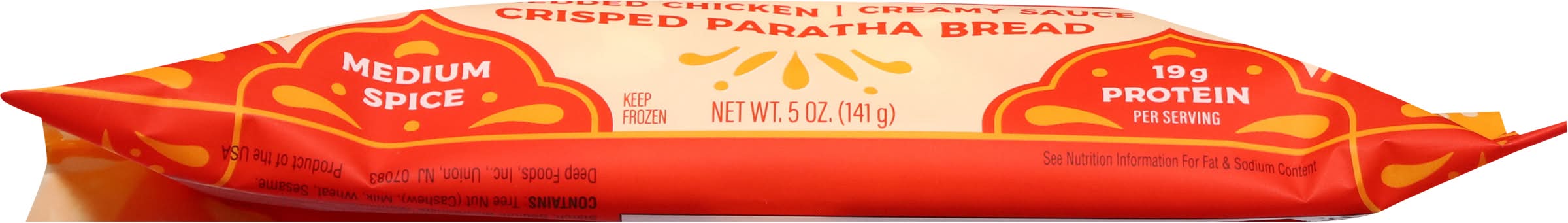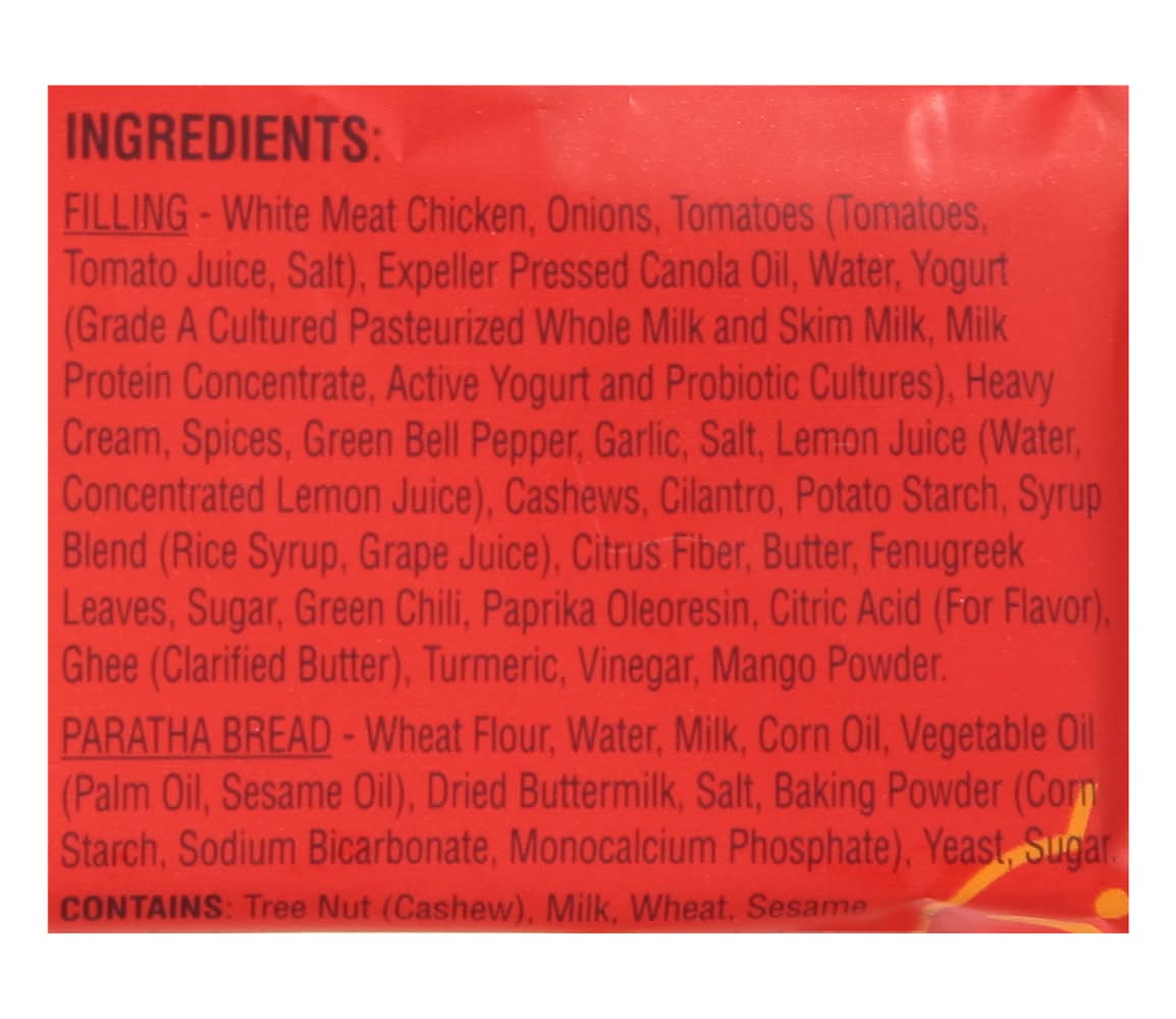 Ingredients: Filling - White Meat Chicken, Onions, Tomatoes (Tomatoes, Tomato Juice, Salt), Expeller Pressed Canola Oil, Water, Yogurt (Grade A Cultured Pasteurized Whole Milk and Skim Milk, Milk Protein Concentrate, Active Yogurt and Probiotic Cultures), HeavyCream, Spices, Green Bell Pepper, Garlic, Salt, Lemon Juice (Water, Concentrated Lemon Juice), Cashews, Cilantro, Potato Starch, Syrup Blend (Rice Syrup, Grape Juice), Citrus Fiber, Butter, Fenugreek Leaves, Sugar, Green Chili, Paprika Oleoresin, Citric Acid (for Flavor), Ghee (Clarified Butter), Turmeric, Vinegar, Mango Powder. Paratha Bread - Wheat Flour, Water, Milk, Corn Oil, Vegetable Oil (Palm Oil, Sesame Oil), Dried Buttermilk, Salt, Baking Powder (Corn Starch, Sodium Bicarbonate, Monocalcium Phosphate), Yeast Sugar Contains: Tree Nuts, Tree Nuts, Cashews, Milk, Wheat, Sesame