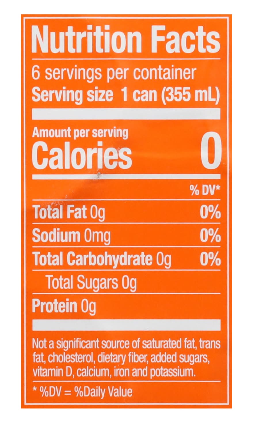 Ingredients: Carbonated Water, Citric Acid, Natural Flavors, Stevia Leaf Extract Contains: 'Free From Gluten'