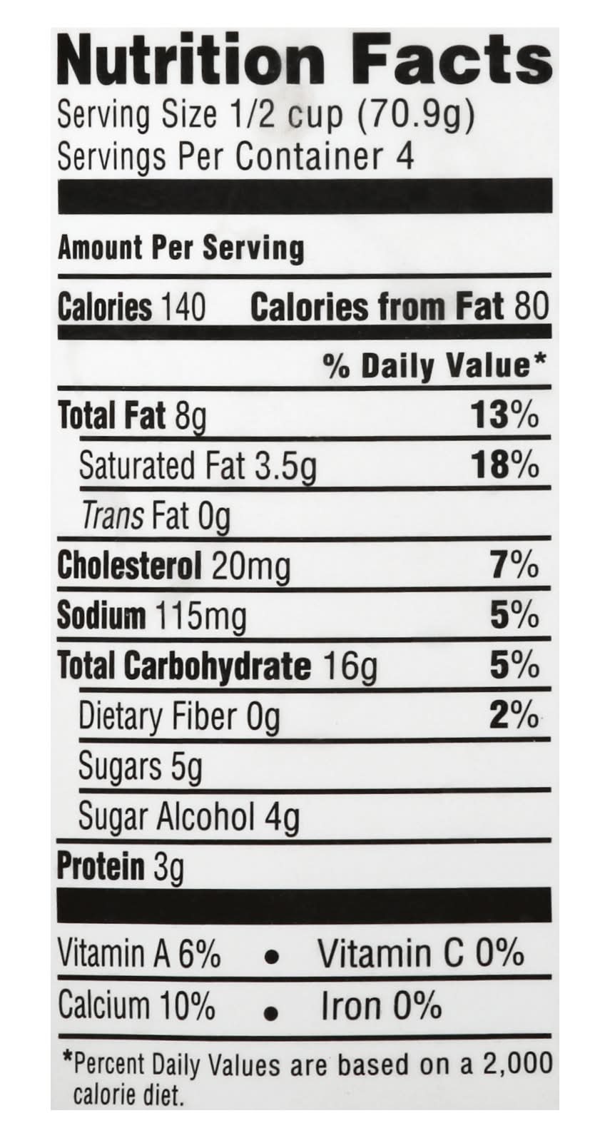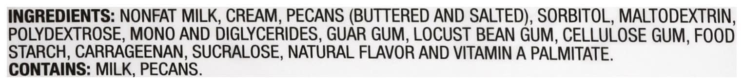 Ingredients: Nonfat Milk, Pecans (Buttered and Salted), Sorbitol, Maltodextrin, Polydextrose, Mono and Diglycerides, Guar Gum, Locust Bean Gum, Cellulose Gum, Food Starch, Carrageenan, Sucralose, Natural Flavor and Vitamin A Palmitate Contains: Milk, Tree Nuts