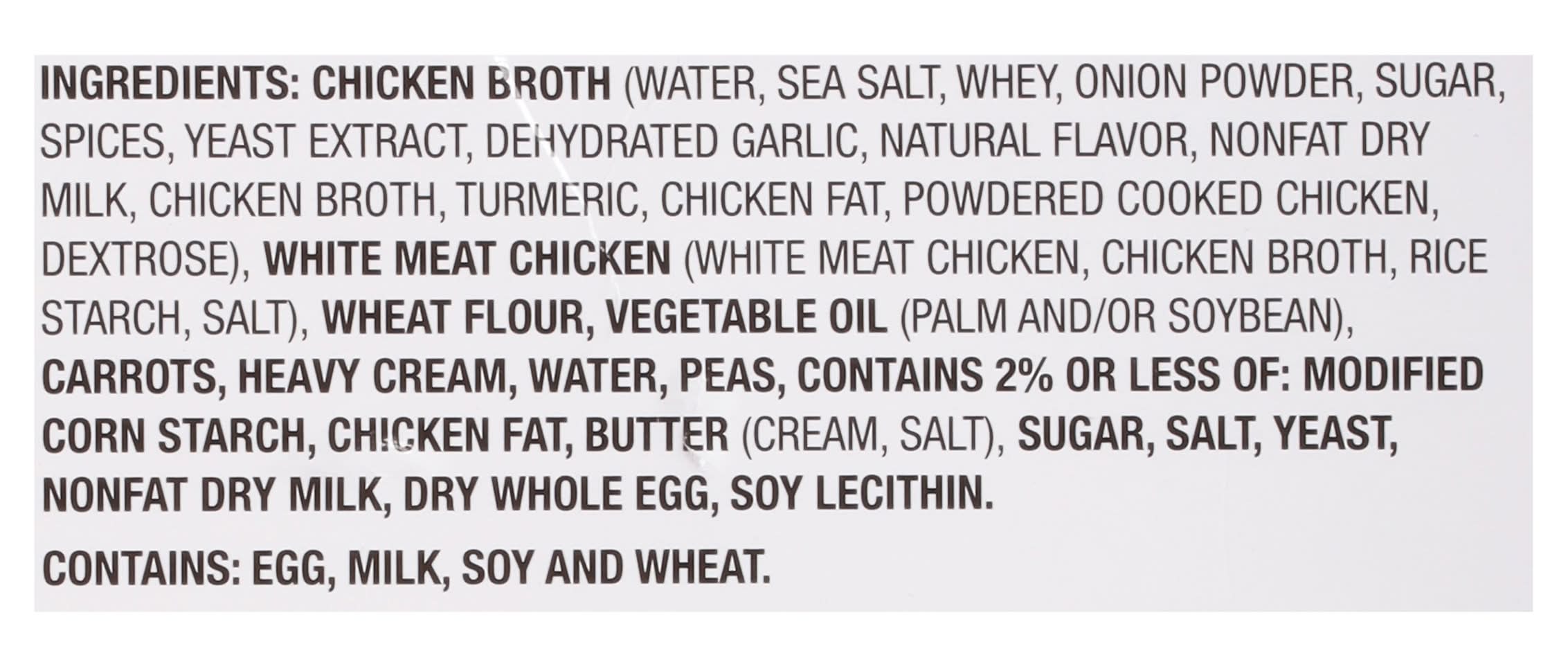 Ingredients: Chicken Broth (Water, Sea Salt, Whey, Onion Powder, Sugar, Spices, Yeast Extract, Dehydrated Garlic, Natural Flavor, Nonfat Dry Milk, Chicken Broth, Turmeric, Chicken Fat, Powdered Cooked Chicken, Dextrose), White Meat Chicken (White Meat Chicken, Chicken Broth, Rice Starch, Salt), Wheat Flour, Vegetable Oil (Palm and/or Soybean), Carrots, Heavy Cream, Water, Peas, Contains 2% or Less of: Modified Corn Starch, Chicken Fat, Butter (Cream, Salt), Sugar, Salt, Yeast, Nonfat Dry Milk, Dry Whole Egg, Soy Lecithin Contains: Eggs, Milk, Soybeans, Wheat, Corn