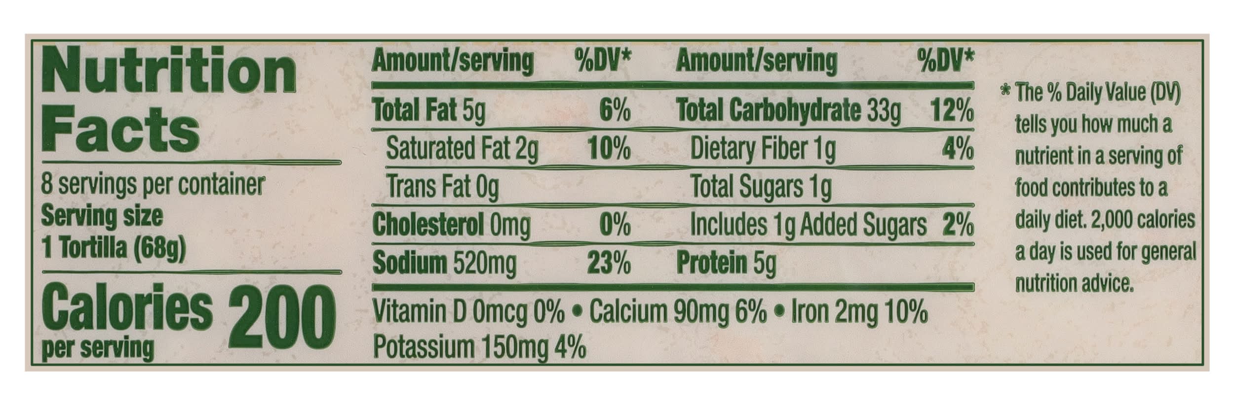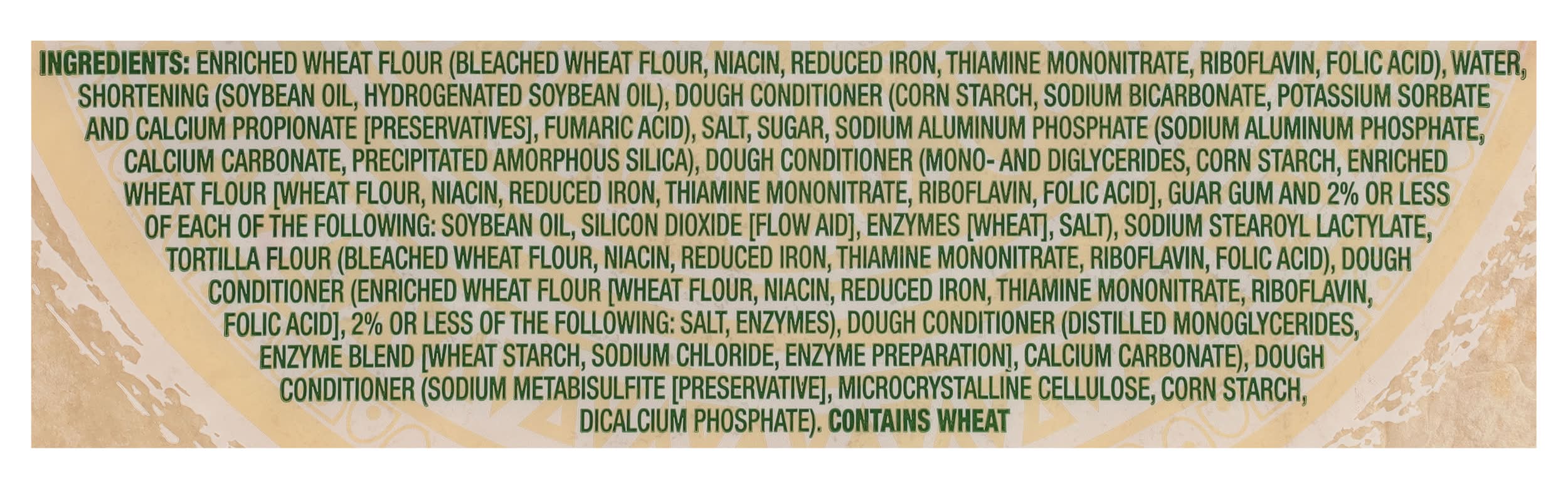 Ingredients: Enriched Wheat Flour (Bleached Wheat Flour, Niacin, Reduced Iron, Thiamine Mononitrate, Riboflavin, Folic Acid), Water, Shortening (Soybean Oil, Hydrogenated Soybean Oil), Dough Conditioner (Corn Starch, Sodium Bicarbonate, Potassium Sorbate and Calcium Propionate [Preservatives], Fumaric Acid), Salt, Sugar, Sodium Aluminum Phosphate (Sodium Aluminum Phosphate, Calcium Carbonate, Precipitated Amorphous Silica), Dough Conditioner (Mono-and Diglycerides, Corn Starch, Enriched Wheat Flour (Wheat Flour, Niacin, Reduced Iron, Thiamine Mononitrate, Riboflavin, Folic Acid], Guar Gum and 2% or Less of Each of the Following: Soybean Oil, Silicon Dioxide (Flow Aid), Enzymes (Wheat], Salt), Sodium Stearoyl Lactylate, Tortilla Flour (Bleached Wheat Flour, Niacin, Reduced Iron, Thiamine Mononitrate, Riboflavin, Folic Acid), Dough Conditioner (Enriched Wheat Flour (Wheat Flour, Niacin, Reduced Iron, Thiamine Mononitrate, Riboflavin, Folic Acid], 2% or Less of the Following: Salt, Enzymes), Dough Conditioner (Distilled Monoglycerides, Enzyme Blend [Wheat Starch, Sodium Chloride, Enzyme Preparation), Calcium Carbonate), Dough Conditioner (Sodium Metabisulfite [Preservative), Microcrystalline Cellulose, Corn Starch, Dicalcium Phosphate) Contains: Wheat, Soybeans, Corn