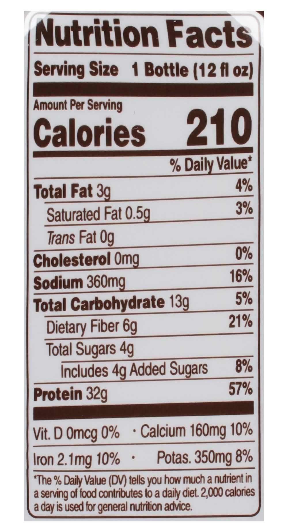 Ingredients: Filtered Water, Pea Protein, Cocoa Powder, Chicory Root Fiber, Natural Flavors, Organic Cane Sugar, Avocado Oil, Sunflower Lecithin, Dipotassium Phosphate, Sea Salt, Locust Bean Gum, Gellan Gum, Vanilla Extract, Cacao Extract and Monkfruit Extract Contains: Tree Nuts, Peanuts