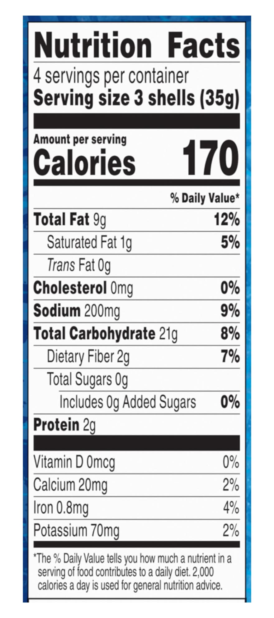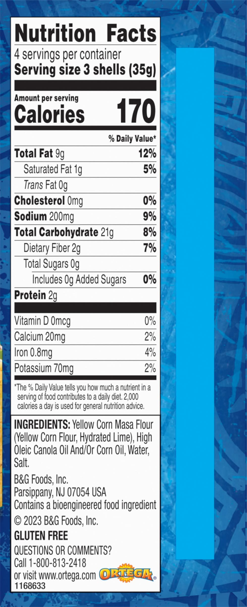 Ingredients: Yellow Corn Masa Flour (Yellow Corn Flour, Hydrated Lime), High Oleic Canola Oil and/or Corn Oil, Water, Salt Contains: Corn