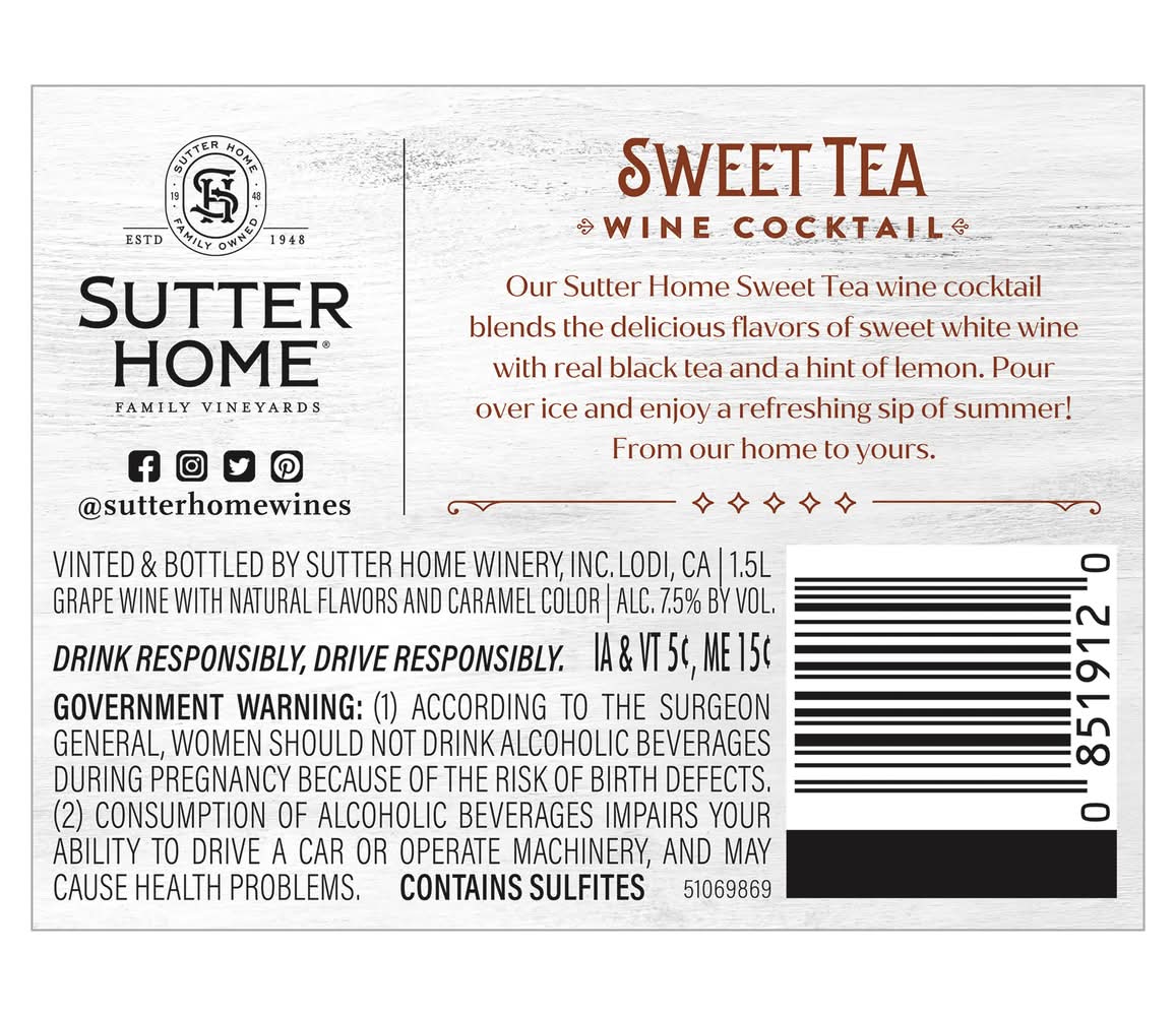 Sutter Home Sweet Tea with Lemon Wine Cocktail has smooth, natural tea flavors mixed with sweet white wine and a hint of lemon to create this Southern inspired beverage. Sweet Tea Wine Cocktail offers a bright, refreshing accompaniment perfect for a warm afternoon. Sutter Home Wine has been awarded over 600 Gold medals since 2004. Pair this Sweet Tea Wine Cocktail well with homemade potato salads, barbecues and front porch happy hours. This wine features grapes sourced from California vineyards. Presented in a wine bottle with a screw cap, this wine is convenient to open without a corkscrew. Serve this fun and festive sweet wine over ice! This bottled wine has 7.5% alcohol by volume. Sutter Home, family owned since 1948, is the brand generations of wine lovers trust to deliver consistent, award-winning quality and value for every wine occasion. Sutter Home, family owned since 1948, is the brand generations of wine lovers trust to deliver consistent, award-winning quality and value for every wine occasion. • Brand: Sutter home • Alcohol by volume: 7.5%