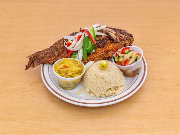 Traditional fermented cassava served with whole tilapia fish.