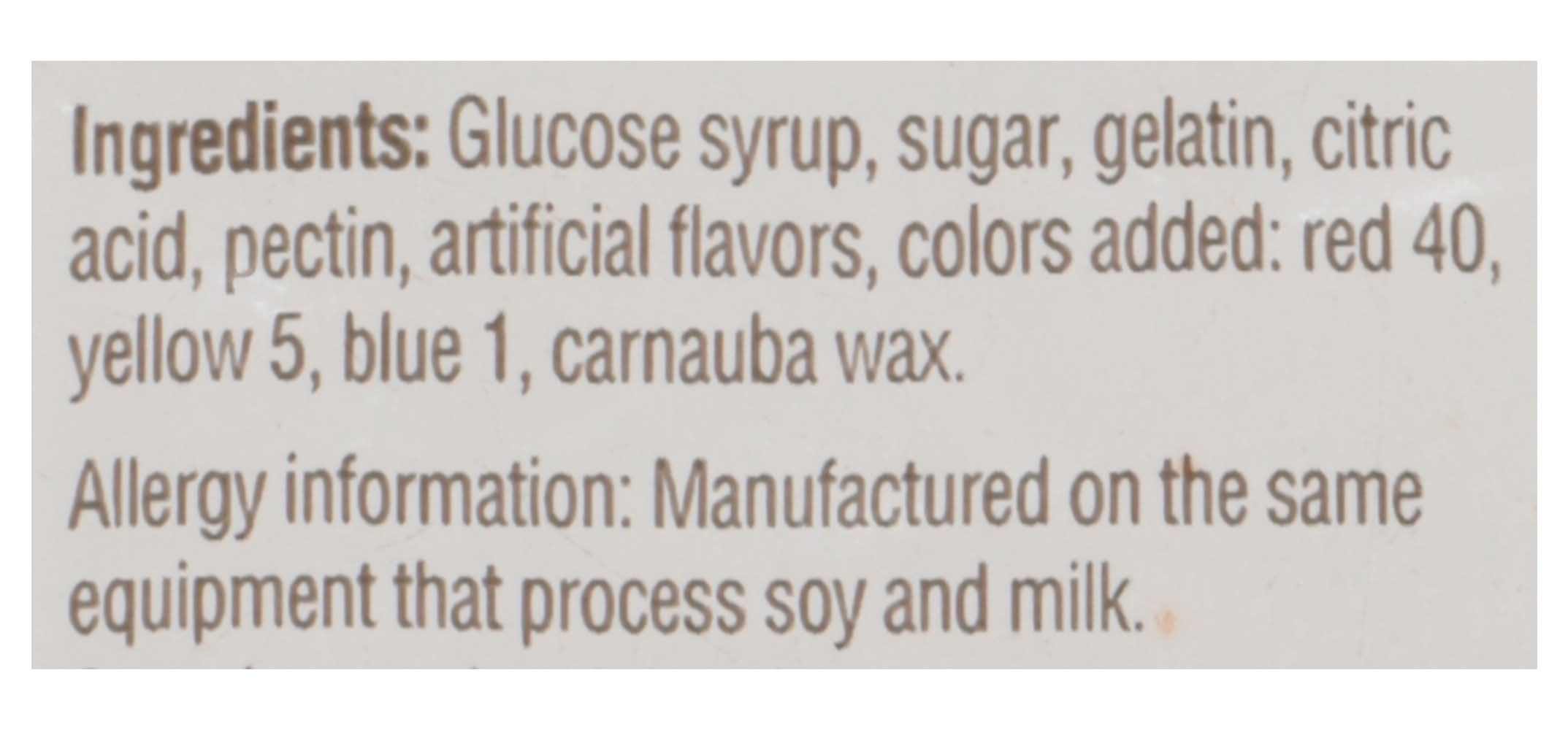 Ingredients: Glucose syrup, sugar, gelatin, citric acid, pectin, artificial flavors, colors added: red 40, yellow 5, blue 1, palm oil, carnauba wax.