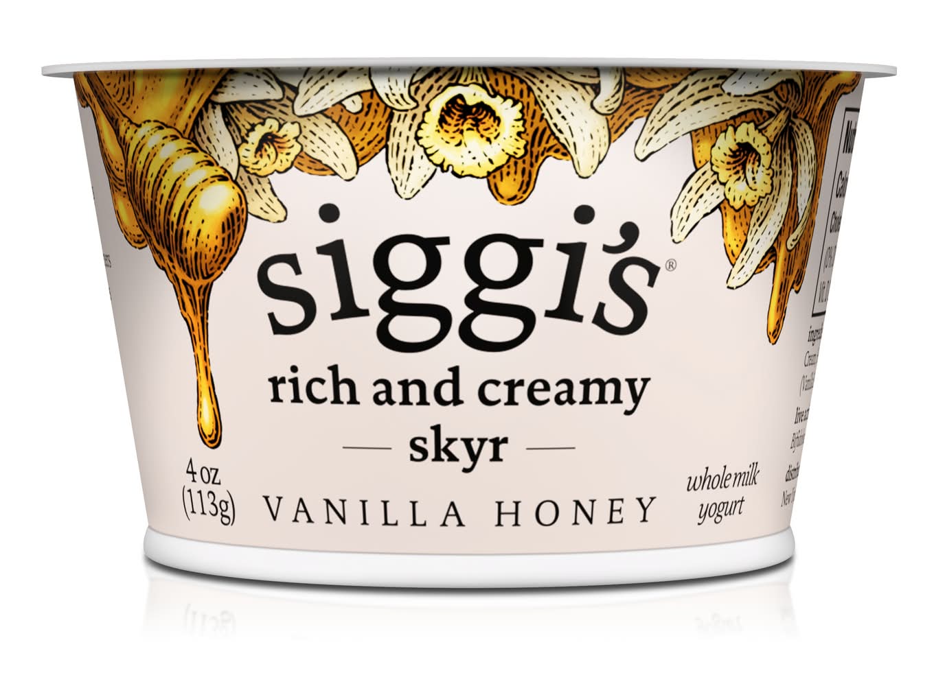 Siggi's Skyr is a whole milk yogurt known for its rich and creamy texture. Crafted without any added colors, artificial sweeteners, gums, starches, preservatives, or stevia, this product maintains a focus on purity. It is certified gluten-free, ensuring it meets dietary needs and preferences. As part of environmentally responsible packaging, customers are encouraged to recycle by removing the label. Icelandic Milk & Skyr, New York, NY 10001