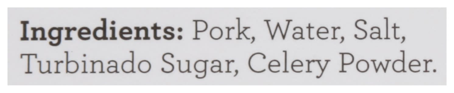 Ingredients: Pork, Water, Salt, Turbinado Sugar, Celery Powder Contains: Celery