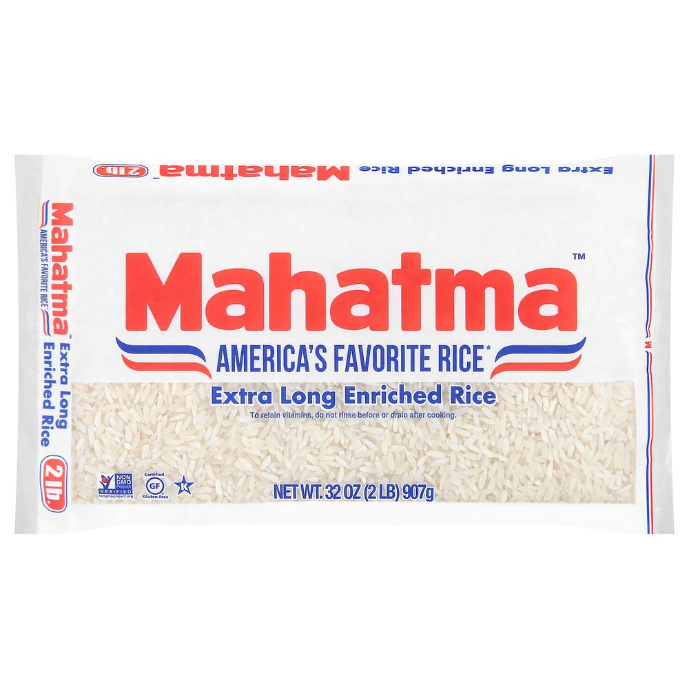 Certified gluten free. Non-GMO Project verified. nongmoproject.org. America's favorite rice (Based on Nielsen non-instant rice category data 2018). www.mahatmarice.com. For free recipes, log onto www.mahatmarice.com. Questions? Comments? Call 1-800-226-9522 Monday-Friday, 8am to 4pm Central Time. Please have package available when calling. Rice - Grown in the USA.