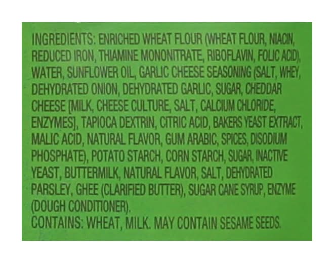 Ingredients: Enriched Wheat Flour (Wheat Flour, Niacin, Reduced Iron, Thiamine Mononitrate, Riboflavin, Folic Acid), Water, Sunflower Oil, Garlic Cheese Seasoning (Salt, Whey, Dehydrated Onion, Dehydrated Garlic, Sugar, Cheddar Cheese (Milk, Cheese Culture, Salt, Calcium Chloride, Enzymes), Tapioca Dextrin, Citric Acid, Bakers Yeast Extract, Malic Acid, Natural Flavor, Gum Arabic, Spices, Disodium Phosphate), Potato Starch, Corn Starch, Sugar. Inactive Yeast, Buttermilk, Natural Flavor, Salt, Dehydrated Parsley, Ghee (Clarified Butter), Sugar Cane Syrup, Enzyme (Dough Conditioner) Contains: Wheat, Milk, Corn, Sesame