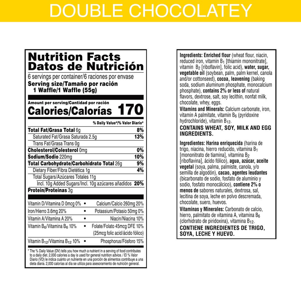 Wake up and greet the day with the feel-good taste of Eggo Thick & Fluffy Double Chocolatey Waffles. Includes one, 11.6-ounce box containing six Eggo Thick & Fluffy waffles. Crafted with delicious ingredients and a craveable chocolatey taste, our waffles offer the perfect balance of crispy, fluffy goodness. Convenient and easy to prepare, Eggo Thick & Fluffy Double Chocolatey Waffles bring warmth to busy mornings; Great for families and individuals, these delicious waffles are made to enjoy as a stand-alone breakfast treat or with your favorite morning toppings like butter and syrup, jellies and preserves, and whipped cream. With no artificial colors and flavors, our waffles also provide a good source of 8 vitamins and minerals. So delicious you just can't L'Eggo! • Kellogg Sales Co., Battle Creek,MI,49016 • Packaging: Reusable