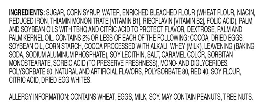Ingredients: Sugar, Corn Syrup, Water, Enriched Bleached Flour (Wheat Flour, Niacin, Reduced Iron, Thiamin Mononitrate [Vitamin B1], Riboflavin [Vitamin B2], Folic Acid), Palm and Soybean Oils with TBHQ and Citric Acid to Protect Flavor, Dextrose, Palm and Palm Kernel Oil, Contains 2% or Less of Each of the Following: Cocoa, Dried Eggs, Soybean Oil, Corn Starch, Cocoa Processed with Alkali, Whey (Milk), Leavening (Baking Soda, Sodium Aluminum Phosphate), Soy Lecithin, Salt, Caramel Color, Sorbitan Monostearate, Sorbic Acid (to Preserve Freshness), Mono- and Diglycerides, Polysorbate 60, Natural and Artificial Flavors, Polysorbate 80, Red 40, Soy Flour, Citric Acid, Dried Egg Whites Contains: Corn, Wheat, Soybeans, Milk, Eggs, Peanuts, Tree Nuts