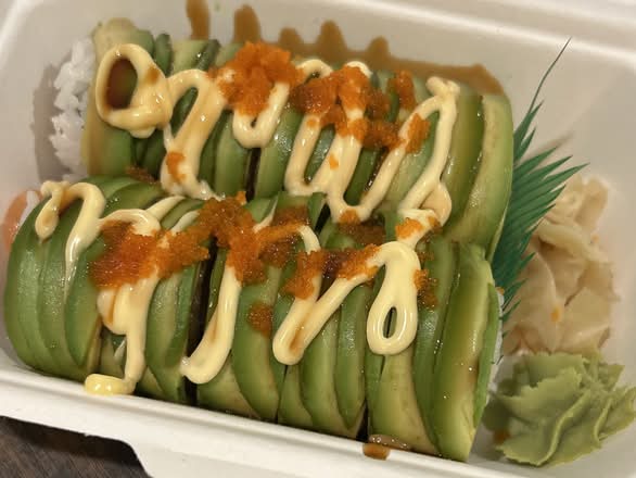 Sushi rice, nori, tuna, salmon, krab meat. Top: avocado slice, mayo sauce, teriyaki sauce, masago (raw).