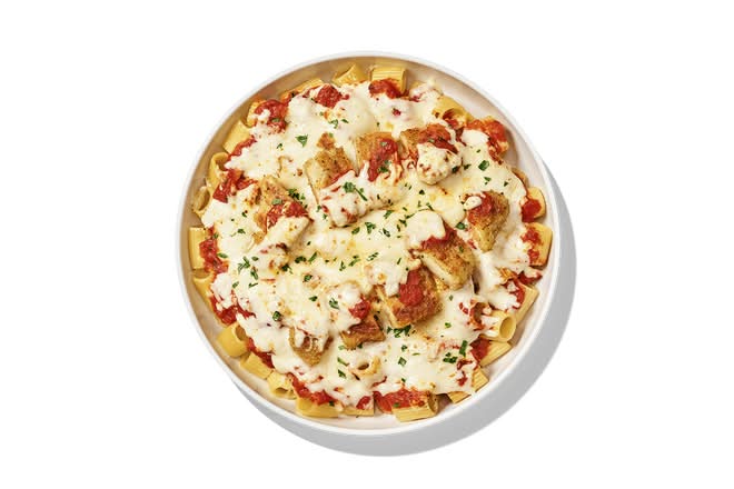 Oven-baked rigatoni noodles in crushed tomato marinara with parmesan-crusted chicken, topped with mozzarella and parsley.