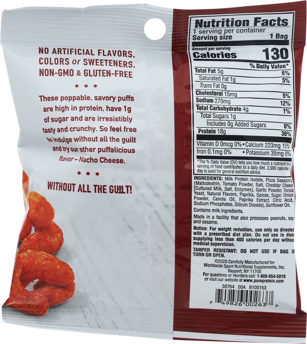 Puffs, Brick Oven Pizza • Number of servings: 1 • Worldwide Sport Nutritional Supplements, Inc., Bayport, NY, 11705, Ph: 800-854-5019