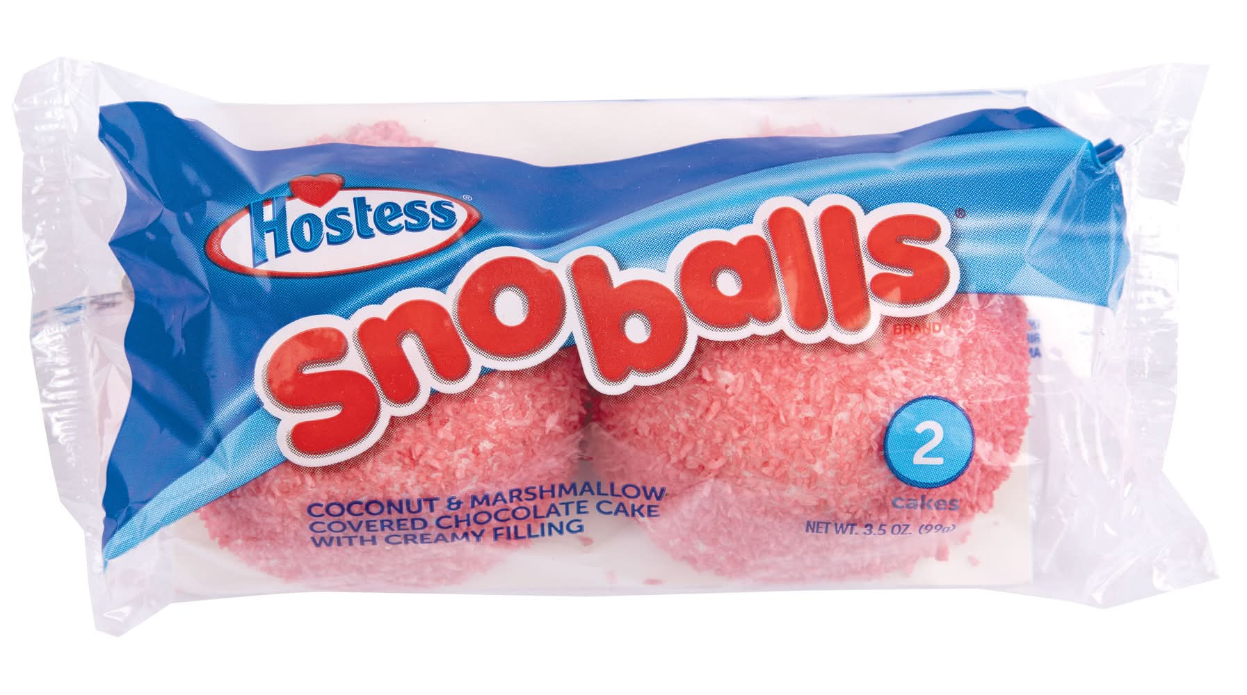 Hostess Snowballs 2pk: Coconut and marshmallow covered chocolate cake with creamy filling. They are a classic Hostess snack and come in different colors depending on the season. • Brand: Hostess • Hostess Brands, Lenexa,KS,66215