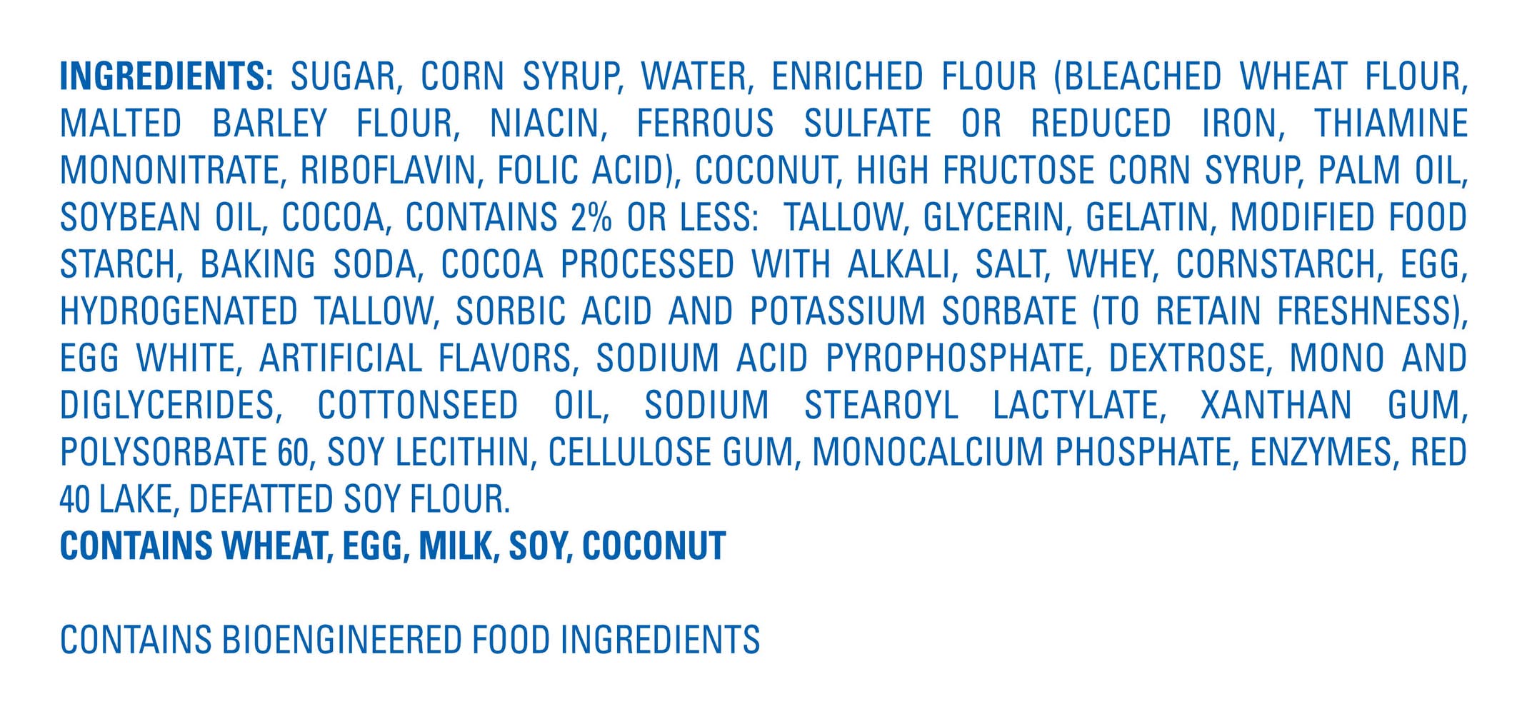 Ingredients: Sugar, Corn Syrup, Water, Enriched Flour (Bleached Wheat Flour, Malted Barley Flour, Niacin, Ferrous Sulfate Or Reduced Iron, Thiamine Mononitrate, Riboflavin, Folic Acid), Coconut, High Fructose Corn Syrup, Palm Oil, Soybean Oil, Cocoa, Contains 2% Or Less: Tallow, Glycerin, Gelatin, Modified Food Starch, Baking Soda, Cocoa Processed With Alkali, Salt, Whey, Cornstarch, Egg, Hydrogenated Tallow, Sorbic Acid And Potassium Sorbate (To Retain Freshness), Egg White, Artificial Flavors, Sodium Acid Pyrophosphate, Dextrose, Mono And Diglycerides, Cottonseed Oil, Sodium Stearoyl Lactylate, Xanthan Gum, Polysorbate 60, Soy Lecithin, Cellulose Gum, Monocalcium Phosphate, Enzymes, Red 40 Lake, Defatted Soy Flour. Contains Wheat, Egg, Milk, Soy, Coconut Contains Bioengineered Food Ingredients Contains: Contains Wheat, Coconut, Soy, Milk, Egg. Contains Bioengineered Food Ingredients.